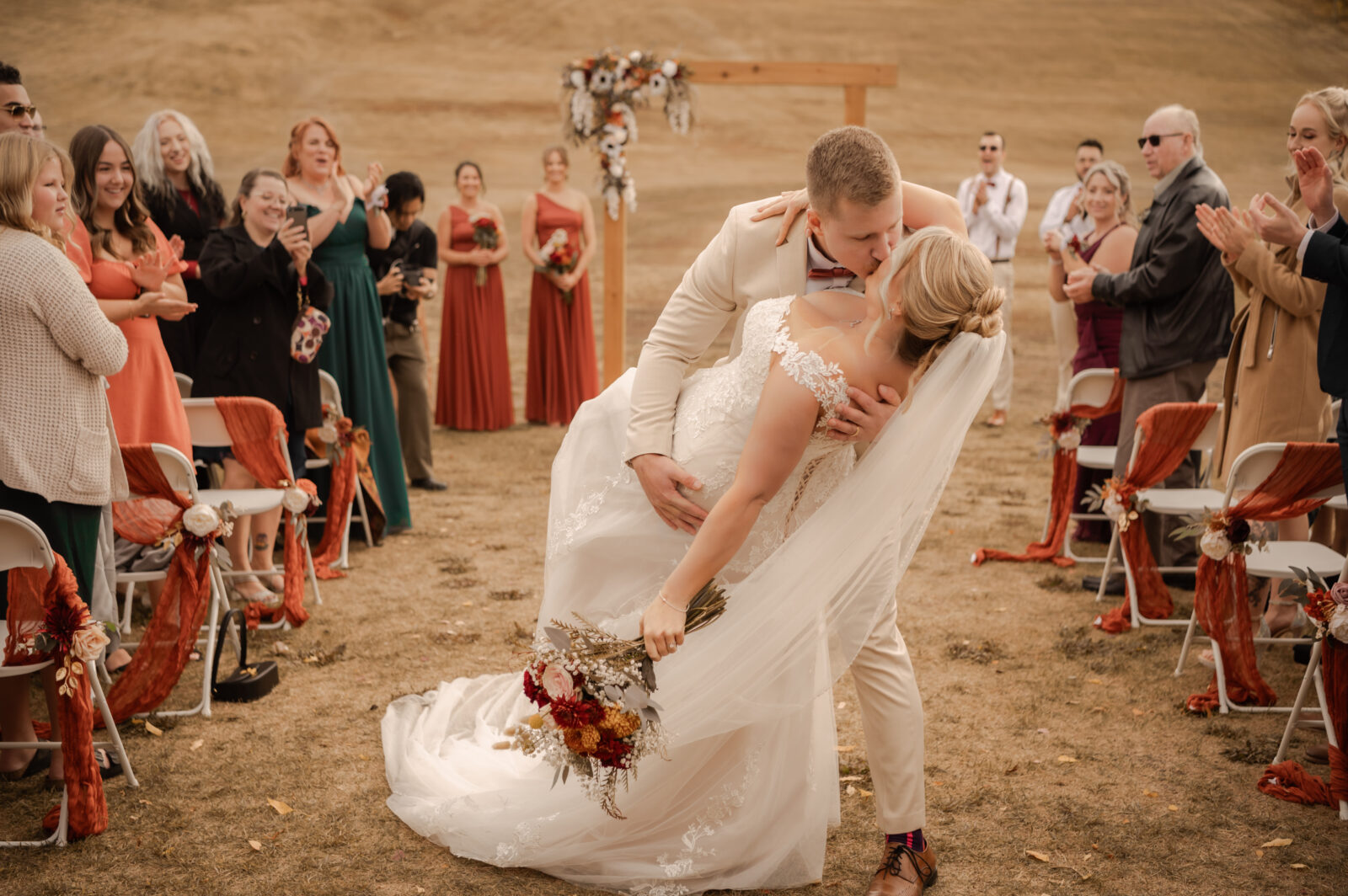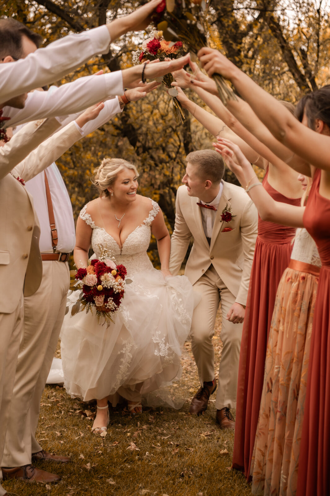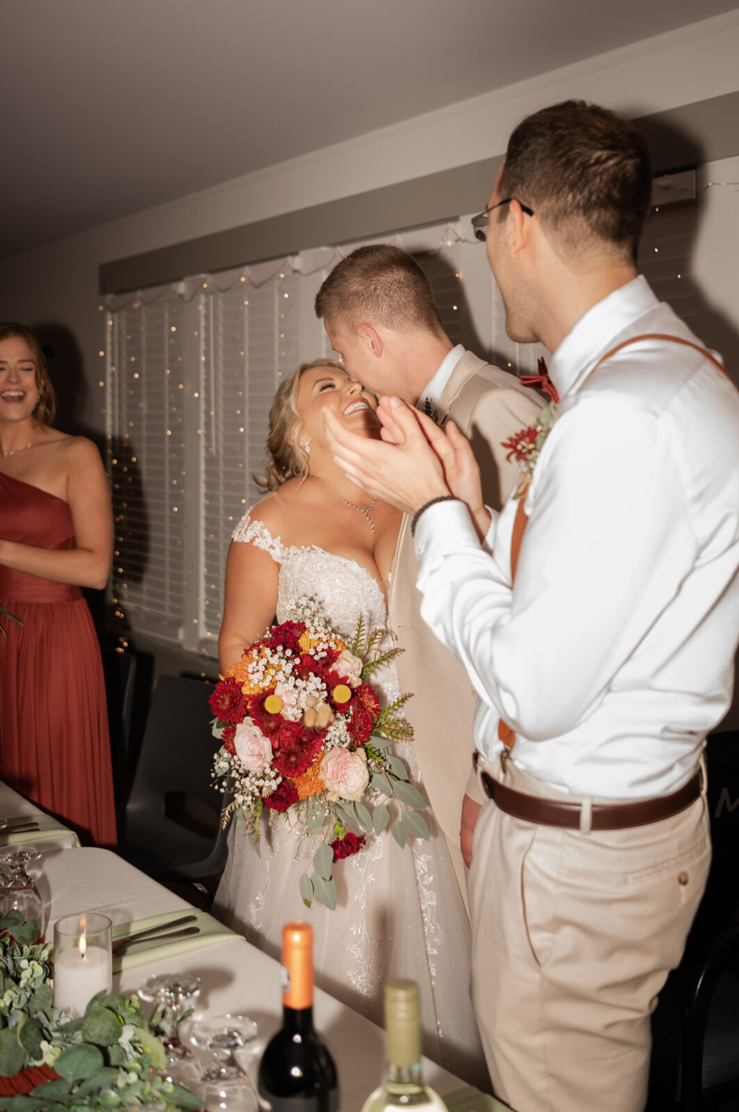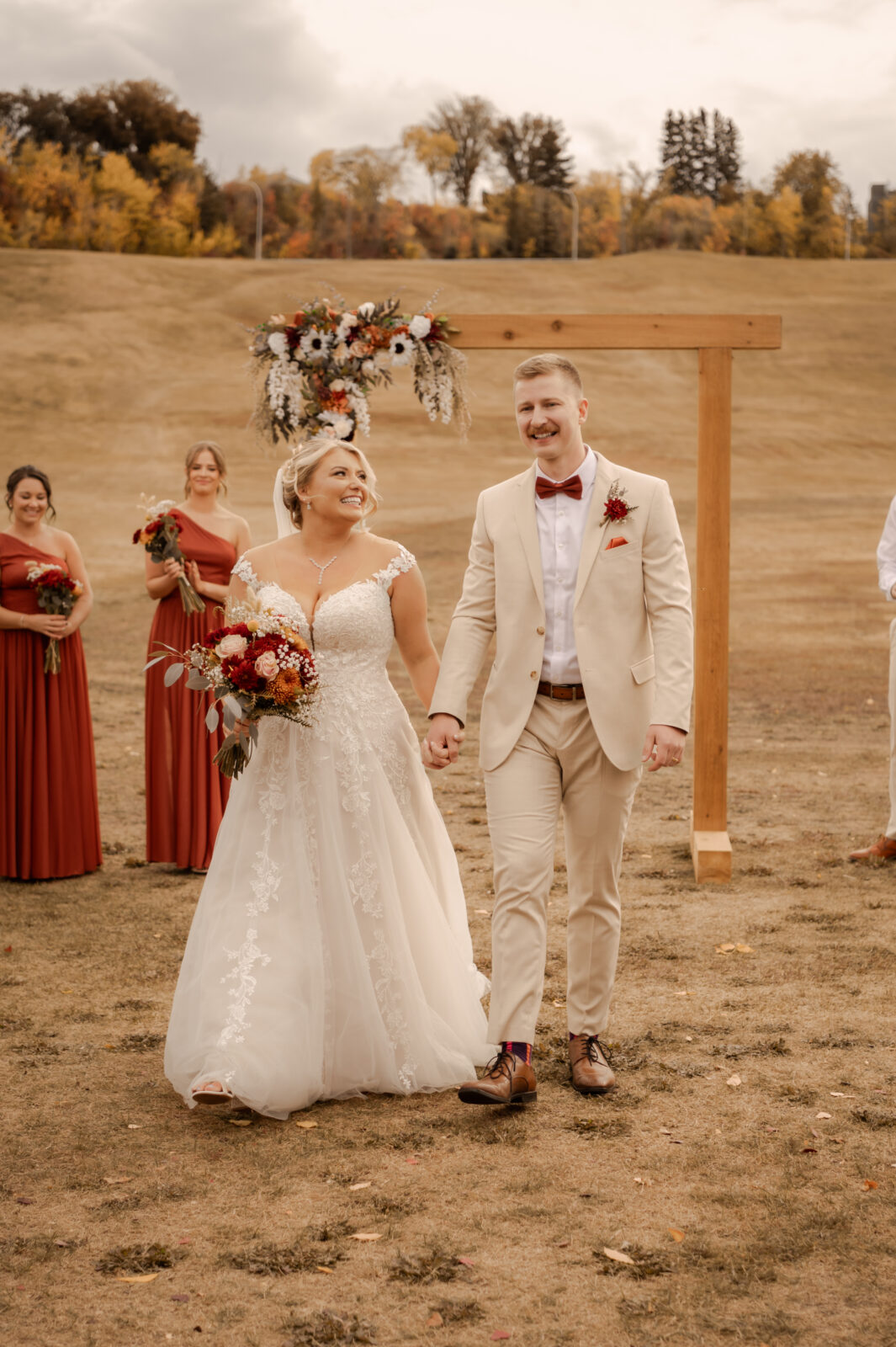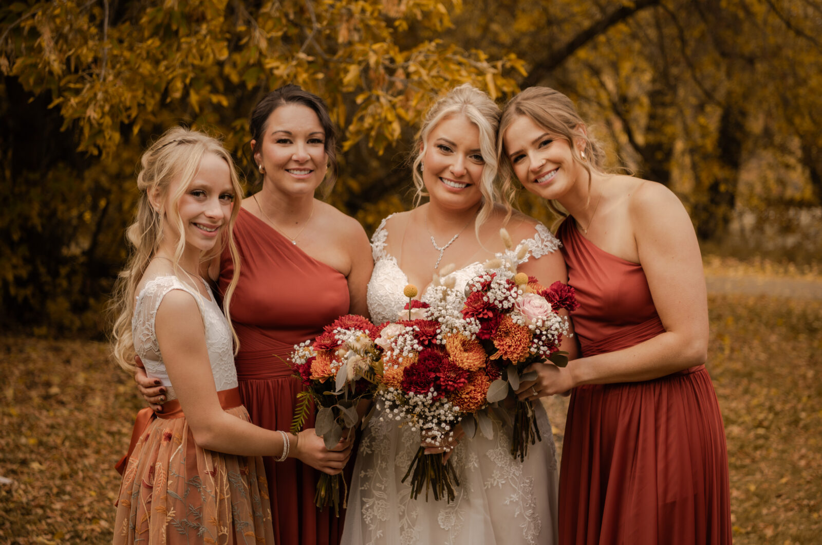 The bridesmaids wore this rich, deep tone that sat somewhere between red and burnt orange, and it worked beautifully with the season.