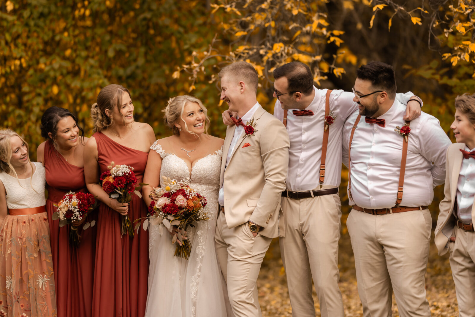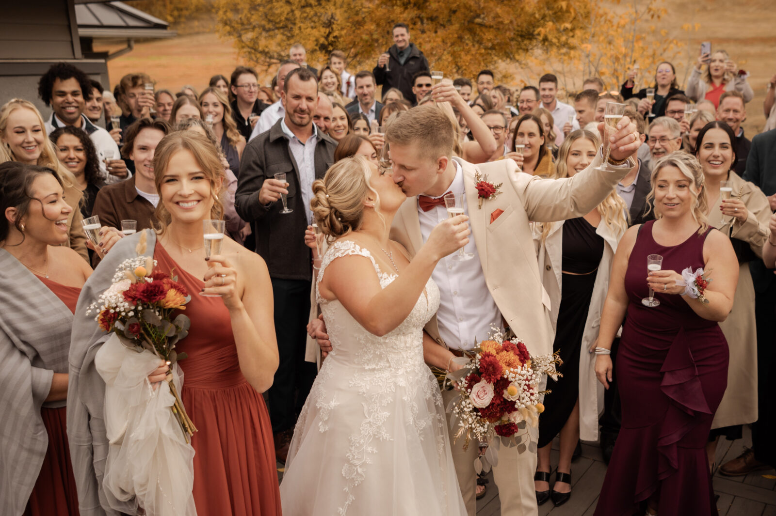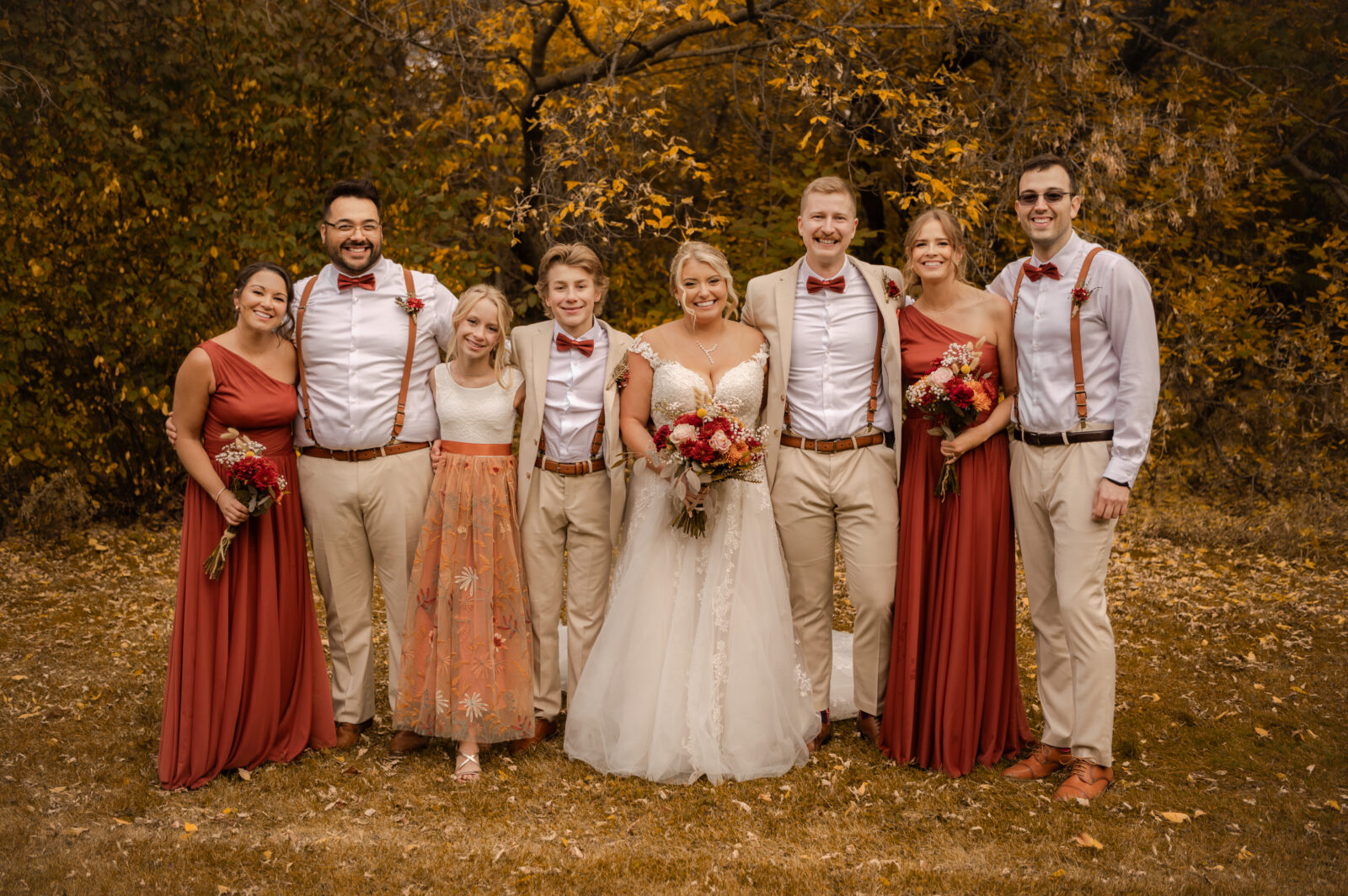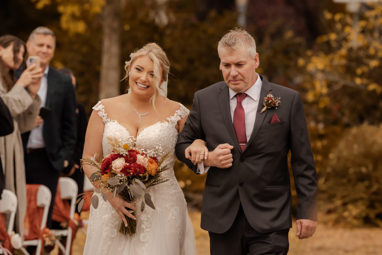 The bridesmaids wore this rich, deep tone that sat somewhere between red and burnt orange, and it worked beautifully with the season.